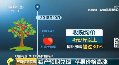 产量的大幅下降,带来了价格高涨,2018年秋季,新果下树,收购价格就冲到高位,以直径在80毫米以上的红富士苹果为例,2018年10月份收购均价在每斤4元钱以上,同比涨幅超过30%。