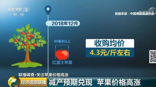 随之而来的2018年秋季苹果收购价格大幅上涨,以直径在80毫米的红富士苹果为例,全国批发均价超过4.6元,这样的价格也是近五年来的高位。