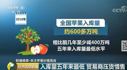 数据显示,2018年全国苹果入库量约为600多万吨。相比前几年的1000万吨左右,至少减了400万吨,这也是五年来入库量最低的水平??獯娲蠓陆?,苹果价格高涨,销量也比往年少了很多。