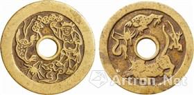 该钱直径46毫米,正面描画了刘海戏金蟾的故事主题;背面描画了“五毒”动物。该币制作精湛,画面刻画生动形象,真实展现了中国古代民俗风尚,其内涵意义和价值值得挖掘。