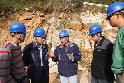 南仁东(左三)与工程技术人员在位于黔南州平塘县的大窝凼施工现场检查施工进展(2014年12月1日摄)。新华社发(中科院国家天文台供图)