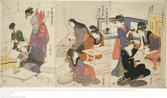 浮世绘作品制作方法与印刷相似,大致流程为艺术家先在纸上画出原图,然后再进行木版雕刻和上色,最后在纸上进行印刷。这种方法不仅可以量产作品,还可以将作品印在折扇、屏风等日用品上。