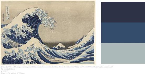 在《神奈川冲浪里》中葛饰北斋用普鲁士蓝的变化将浪花中的层次变化表现得分明且不破坏画面的整体,可见他对色彩的敏感度之高和运用手法之极。