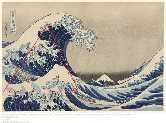 《神奈川冲浪里》画面中的富士山虽然处于画面中黄金分割的位置,但是在三角构图的巨浪前现得非常脆弱。