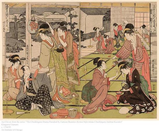 浮世绘中大部分的美人绘描绘的是宴会中游走于宾客之间的艺妓,而喜多川歌麿更擅长描绘艺妓的肖像特写和日常生活,表现出她们普通人的一面。