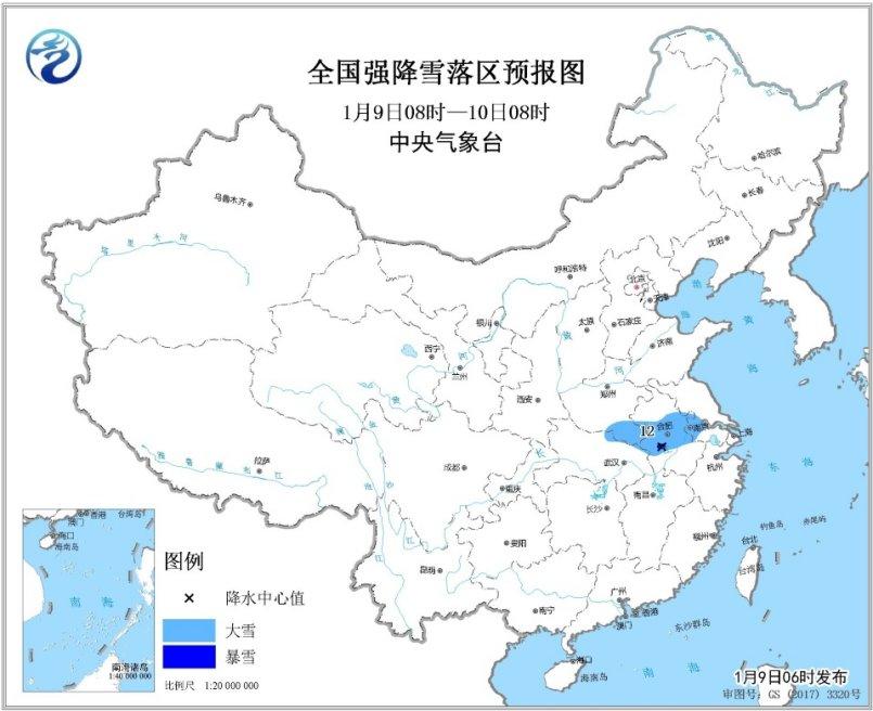 受冷空气与暖湿气流共同影响,预计9日至10日,黄淮中南部、江淮、江汉北部将有一次较强降雪过程。预计9日08时至10日08时,河南南部、湖北东北部、安徽中部、江苏西南部等地的部分地区有大雪,局地暴雪(10~12毫米),上述地区积雪深度3~5厘米,局地可达8厘米以上。