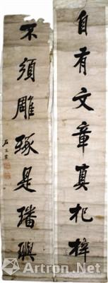 这副“自有文章真杞梓,不须雕琢是璠?!倍粤迹?,为原裱,水墨纸本,立轴,下联有“左宗棠”题识并有钤印,保存基本完好,现藏陕西宝鸡青铜器博物院。对联上虽然没有书写时间,但与该院同时收藏的左宗棠的另一条幅对照,当是晚清重臣左宗棠赴任新疆途中留在西北的墨宝。对联中“自有文章真杞梓,不须雕琢是璠?!背鲎员彼挝难Ъ摇⑹费Ъ?、政治家曾巩诗作《简翁都官》中,意思是“天然就有杞梓那样美好的才干,不用进行雕琢就是美玉”。曾巩为政廉洁奉公,勤于政事,关心民生疾苦,文学成就突出,为唐宋八大家,世称“南丰先生”,为左宗棠所崇拜。