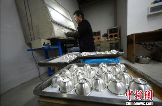 图为技术工人在打磨抛光银酒杯?!』葡!∩?/p>