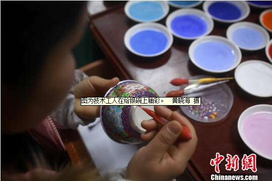 图为技术工人在给银碗上釉彩?!』葡?摄