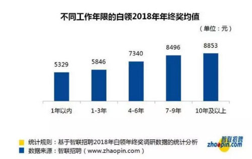 工龄方面,调查显示,年终奖额度也是跟工龄正相关的,工龄每升一个阶段,年终奖均会有大幅的提升,工作10年及以上的白领的年终奖均值为8853元,工作1年以内的均值仅为5329元,职场资深人士的年终奖是新人的近1.6倍。