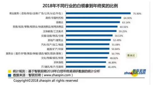 像2018年对互联网/通讯等行业来说不太“友好”。调查显示, 商业服务行业的白领能拿到年终奖的比例最多,为75.90%,其次是政府/非营利机构和金融业,分别为64.90%和63.14%。