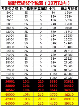 另一个值得关注的是图中黄色底对应的低效区间。4万元年终奖,看着比3.6万多出了4000元,实际到手的分别是36210元和34920元,只多出1290元。