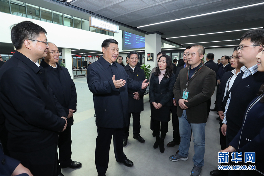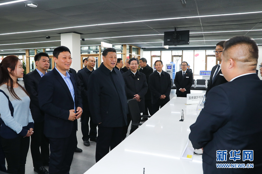1月16日,中共中央总书记、国家主席、中央军委主席习近平在河北雄安新区考察调研。这是习近平在雄安新区政务服务中心同部分进驻雄安新区的企业代表亲切交谈。 新华社记者 鞠鹏 摄