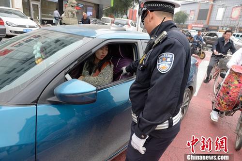 资料图:交警拦停车辆。中新社记者 刘文华 摄