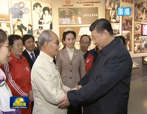 老人掀开衣领向习近平展示缝在里面的信息牌。习近平仔细察看,轻轻抚摸着已然泛黄的军装,认真地点头说:“这是个历史文物了!”