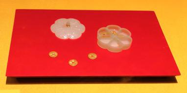 痕都斯坦白玉梅花式盒与贮存其中的“花钱”。古人过年包饺子时会放钱币,皇帝元旦时吃的饺子里也包有钱币,以预示一年吉利,但其中所包的并不是实际流通的钱币,而是“花钱”。