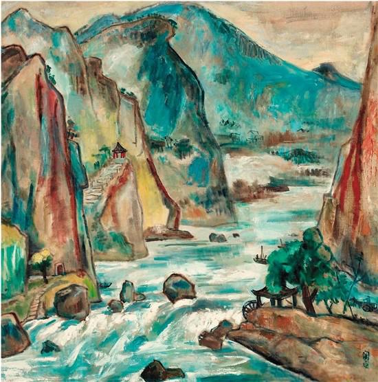 归国后,关良继续风景画创作,从《新安水电站》《牧?!返?0世纪60年代以上海为主题的作品,如《上海港》《苏州河》等,皆与德国写生一脉相承。1980年,耄耋之年的关良,根据抗战时期的写生稿,重绘了《石门》,成为其晚年最具代表性的风景画。山峰以彩色勾线,以霁青、赭石、柠檬黄、橘红等色平涂,橙红的天空,斑斓的水波,构图则兼具中国与西画特色,既寓“山红涧碧纷烂漫”之情调,又有“飞湍瀑流争喧豗”的声势。2011年,以2300万落槌,创关良风景画拍卖的纪录。