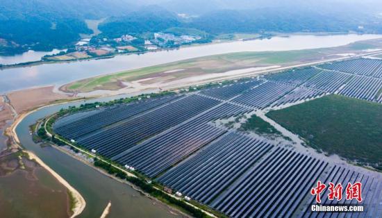 资料图:江西省新余市分宜县70兆瓦“渔光互补”光伏电站气势恢宏,周边滩涂湿地引来鱼跃鸟飞,景致如画。中新社记者 柳俊武 摄