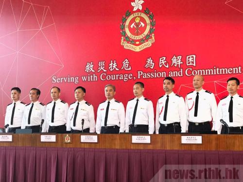 香港消防处处长李建日(中)出席记者会。图片来源:香港电台网站 任顺熙 摄