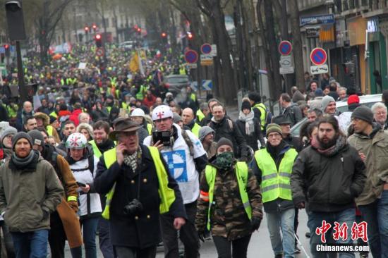 资料图:当地时间1月19日,巴黎遭遇自2018年11月以来的第十轮示威。图为示威游行队伍当天穿过巴黎市中心。中新社记者 李洋 摄