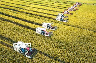 2018年9月20日,农民驾驶收割机在江苏省淮安市盱眙县黄花塘镇老营“虾稻共生”示范基地收获水稻。
