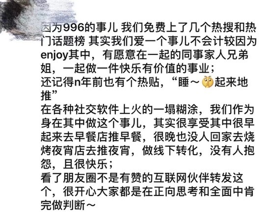 某有赞员工在朋友圈对公司“996”工作制的观点