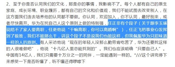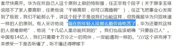“CEO的(白鸦)原话是,我们不相信没有事业心的人能在工作上追求极致,如果一个人说工作就是工作生活就是生活,下班了工作的事情不能找他,有工作问题周末不要回复,那他没法适应我们这里。在这家创业公司,工作和生活是分不开的,客户遇到问题了不管是不是下班时间我都会找你,你不理我我肯定对你不客气。当然,想休息了,实在是起不来想睡个懒觉了,群里说一声今天晚到也没人为难你?!毙说,在他看来,之后举了华为的段子为例,主要是为了鼓励员工的奉献精神,既然说了是段子,没必要乱扣帽子。