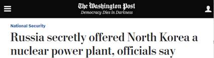【环球网报道】美国《华盛顿邮报》29日独家曝光一个“猛料”——为换取朝鲜销毁核武器,俄罗斯去年曾提议送给平壤一份大礼——一座核电站。当然,美国媒体依据“消息人士透露”这种套路做出来的新闻,并未得到俄罗斯方面证实。