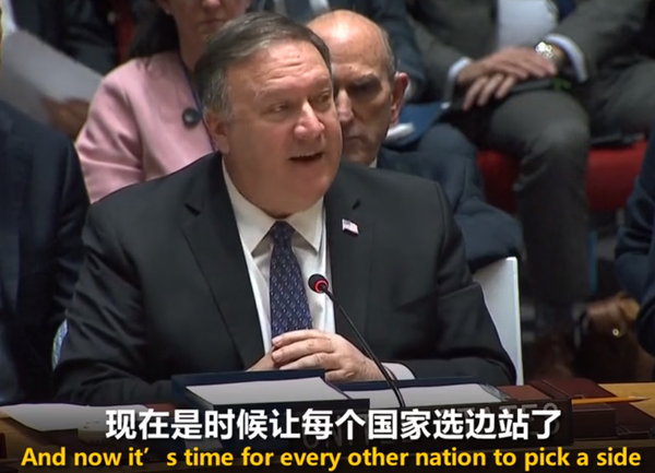美国国务卿蓬佩奥在安理会紧急会议上发言 视频截图
