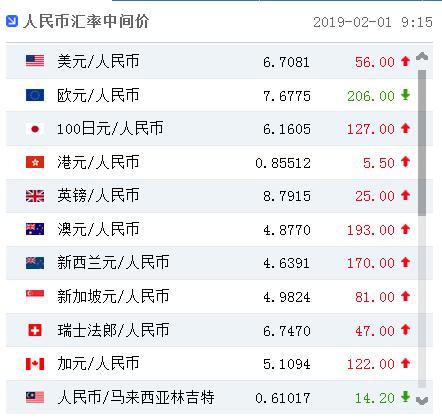 中国人民银行授权中国外汇交易中心公布,2019年2月1日银行间外汇市场人民币汇率中间价为:1美元对人民币6.7081元,1欧元对人民币7.6775元,100日元对人民币6.1605元,1港元对人民币0.85512元,1英镑对人民币8.7915元,1澳大利亚元对人民币4.8770元,1新西兰元对人民币4.6391元,1新加坡元对人民币4.9824元,1瑞士法郎对人民币6.7470元,1加拿大元对人民币5.1094元,人民币1元对0.61017马来西亚林吉特,人民币1元对9.7572俄罗斯卢布,人民币1元对1.9768南非兰特,人民币1元对165.89韩元,人民币1元对0.54766阿联酋迪拉姆,人民币1元对0.55923沙特里亚尔,人民币1元对41.1425匈牙利福林,人民币1元对0.55524波兰兹罗提,人民币1元对0.9725丹麦克朗,人民币1元对1.3484瑞典克朗,人民币1元对1.2572挪威克朗,人民币1元对0.77228土耳其里拉,人民币1元对2.8485墨西哥比索,人民币1元对4.6598泰铢。