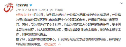 据了解,区园林市政管理中心、什刹海冰场运营方已与伤者取得联系,待病情好转后面谈相关事宜。