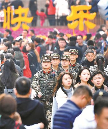 2月7日,武警重庆总队执勤第二支队官兵在重庆解放碑景区巡逻。穆洪超摄