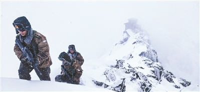 2月9日,西藏军区某边防团詹娘舍哨所官兵顶风冒雪巡逻在边防线上。王乾摄