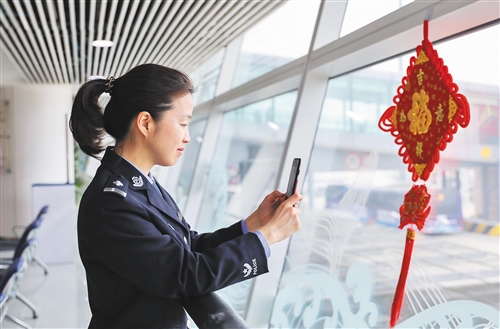 2月6日,青岛机场出入境边防检查站女子旅检科民警冯哲利用工作间隙与远在老家的儿子视频通话。解 豪摄(新华社发)