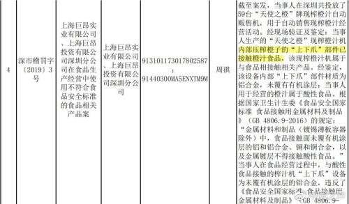 据中国之声《新闻纵横》报道,近年来,各大商场的角落里悄然出现了一批智能方便的橙汁自动贩卖机。明亮的橙色外观、新颖的操作方式,一出现便吸引了很多人的目光。从机器的玻璃窗中可以看到,交费后,数枚橙子将自动落下,由机器现场榨汁,一杯新鲜的橙汁由此“诞生”。然而今年年初,深圳市市场监管部门却因为“天使之橙”鲜榨橙汁机内部的铝合金抓头没有镀膜,直接接触酸性食品,涉嫌违反《食品安全法》要求,对其处以119万元??睢?/p>