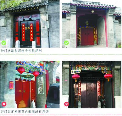 《导则》中的图例,形象直观。街门过度采用苏式彩画进行装饰,色彩不符合老北京的风貌特征。