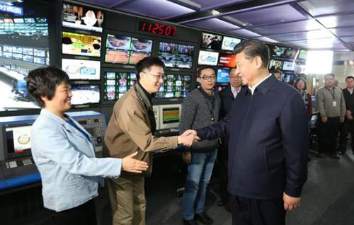 2016年2月19日,习近平到中央新闻单位调研。图为习近平在中央电视台总控中心同工作人员亲切握手。