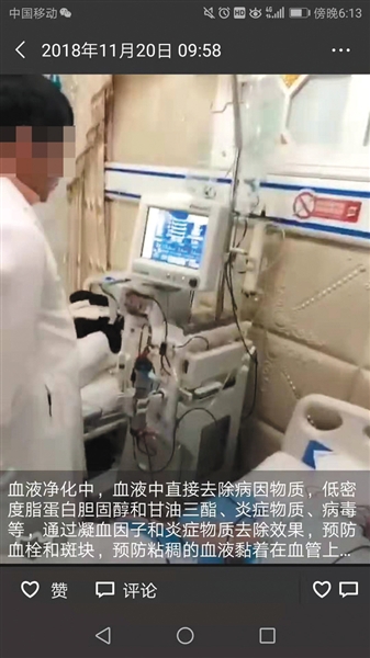 北京东直门附近一家医疗美容机构的“医生”在微信朋友圈中介绍血液净化项目。微信截图