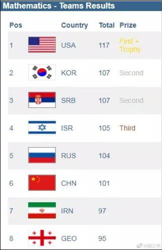 大赛网站显示:个人成绩排名中,第一名是以色列选手,他获得了41分,差1分满分;包括他在内,共有9名参赛者获得金牌;来自中国的参赛者最高成绩是35分,共有3人获得这个分数,分别排在第15、第16和第18名;6名中国参赛者中,没有人获得金牌,4人获得银牌,1人获得铜牌,1人获鼓励奖。
