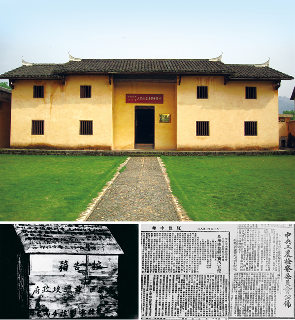 在中央苏区、延安时期,我们党探索了一套对苏维埃政府、边区政府和革命根据地人民政权组织及其工作人员的监督办法。 上图为江西瑞金中华苏维埃共和国工农检察委员会旧址;下左图为当年江西兴国县高兴区苏维埃政府工农检察部设置的控告箱;下右图为《红色中华》报关于中央印刷厂等单位贪污案查处结果和检举于都县苏维埃工作人员营私贪污案的报道。 中共江西省赣州市委党史办供图