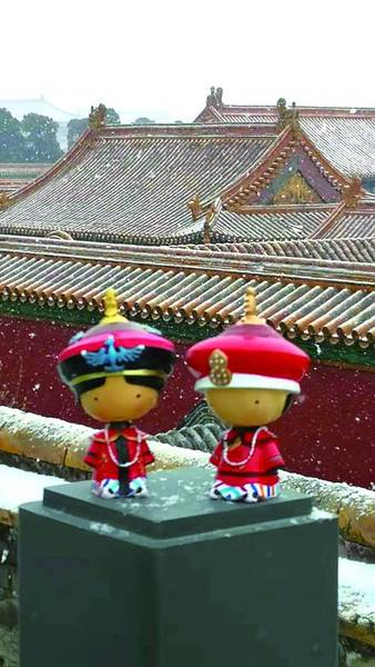 记得在宫墙上雪越下越大的时候,一个小伙子摆了故宫的文创产品格格与阿哥的玩偶,以紫禁城为背景在拍雪景,路过的我立刻抢拍了一张。的确,故宫自从新馆长单霁翔上任之后,数次登上热搜榜。北京卫视的综艺节目《上新了·故宫》豆瓣评分高达8.2,纪录片《我在故宫修文物》也广受好评,而故宫的许多文创产品更是成为时下年轻人的掌上爱物。