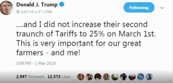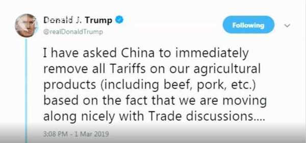 “我已经要求中国立即取消针对美国农业产品的所有关税(包括牛肉、猪肉等),这是基于我们在贸易谈判中进展良好的事实。我在3月1号没有对第二批中国商品加征25%的关税。这对于我们伟大的农民和我都非常重要?!碧乩势盏碧煸谕铺厣戏⑽乃?。