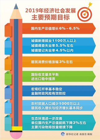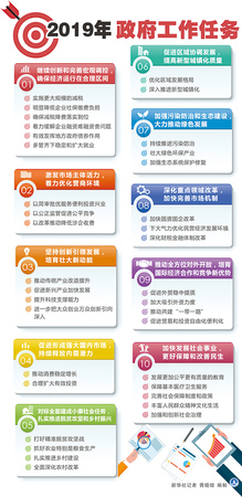 本报北京3月5日电 国务院总理李克强5日在向十三届全国人大二次会议作政府工作报告时,提出2019年中国在国内生产总值增长、居民消费价格涨幅、就业、财政支出、节能减排、供给侧结构性改革等各方面的预期发展目标,提出做好2019年度工作的总基调,并分10个方面对2019年政府工作提出建议。