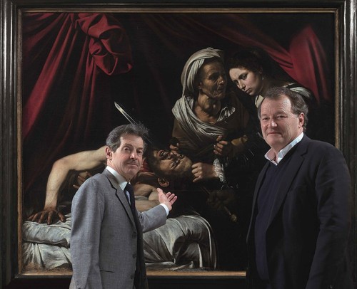 古典绘画鉴定专家Eric Turquin(左)及拍卖师Marc Labarbe (右 )站在卡拉瓦乔名画《朱迪斯与赫罗弗尼斯》前,图片来自于Cabinet Turquin。