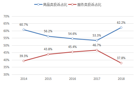 一是商品投诉比重扩大。2018年,全国市场监管部门共受理商品投诉231.81万件,占比62.2%,同比增长61.3%,服务投诉140.75万件,占比37.8%,同比增长12.1%。商品投诉主要集中在日用百货、食品、家用电器、交通工具、通讯器材等领域。服务投诉主要集中在远程购物、居民服务、互联网服务、文化娱乐服务、修理维护服务等领域。