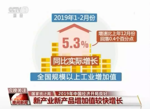 1至2月份,全国规模以上工业增加值同比实际增长5.3%,增速比上年12月份回落0.4个百分点。其中,新产业新产品较快增长,战略性新兴产业增加值同比增长10.1%,增速快于全部规模以上工业4.8个百分点。