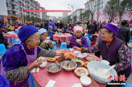 资料图:1月31日,贵州省黔南布依族苗族自治州惠水县在易地扶贫搬迁社区开展社区2019年春节系列文化活动,4216户17670名易地扶贫搬迁民众欢聚一堂,同吃团圆饭,共迎幸福年。中新社记者 贺俊怡 摄