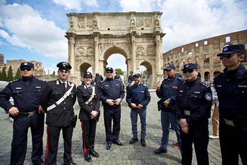 2016年5月2日,中意首次联合警务巡逻在意大利罗马启动。在意大利罗马君士坦丁凯旋门外,中方警员与意方警员合影。新华社记者金宇摄
