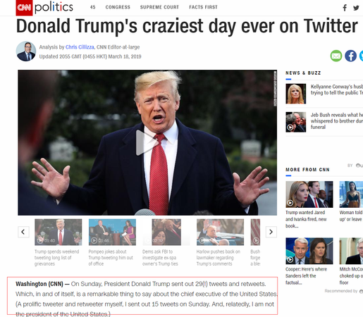上周日,美国总统特朗普一天之内发了29条推文。第二天(18日),美国有线电视新闻网(CNN)发文感慨说 , 这是他“最疯狂的一天”。