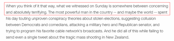 “我们在周日目睹的事情,介于忧虑与绝对令人恐惧之间?!闭饧颐教迦衔?,这个国家最有权势的人耗费了大量时间在宣扬他未经证实的阴谋论上。并且,他发了这么多条推文,却没有一条关于新西兰悲惨枪击案的内容。